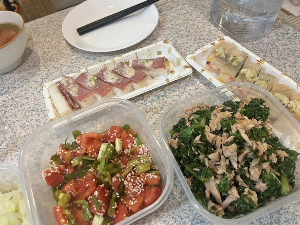 夜ご飯は、白ごはんに味噌汁や、鍋、おひたしといった日本スタイルが多いです。バンクーバーではお米は比較的安く手に入りますし、アジア系スーパーも多いので色々と作り置きしています。たまに贅沢してお寿司を買ったりもしてます☺️